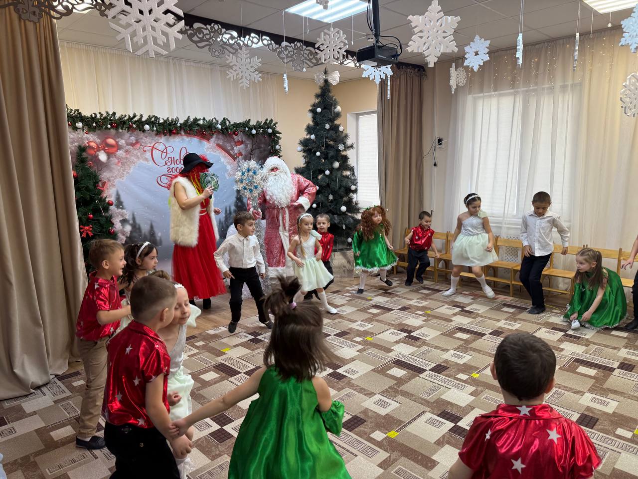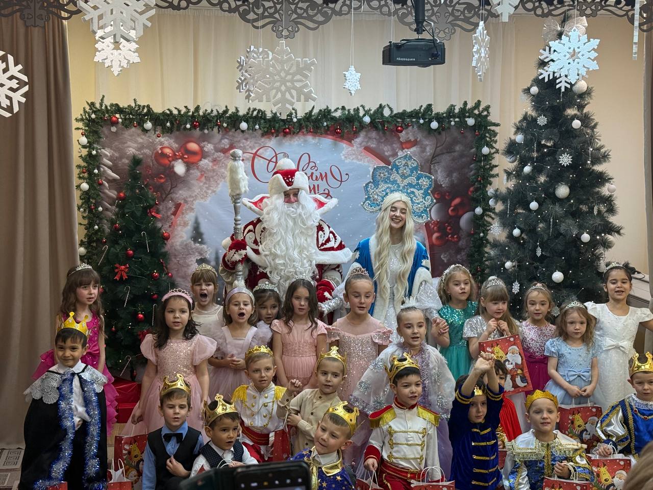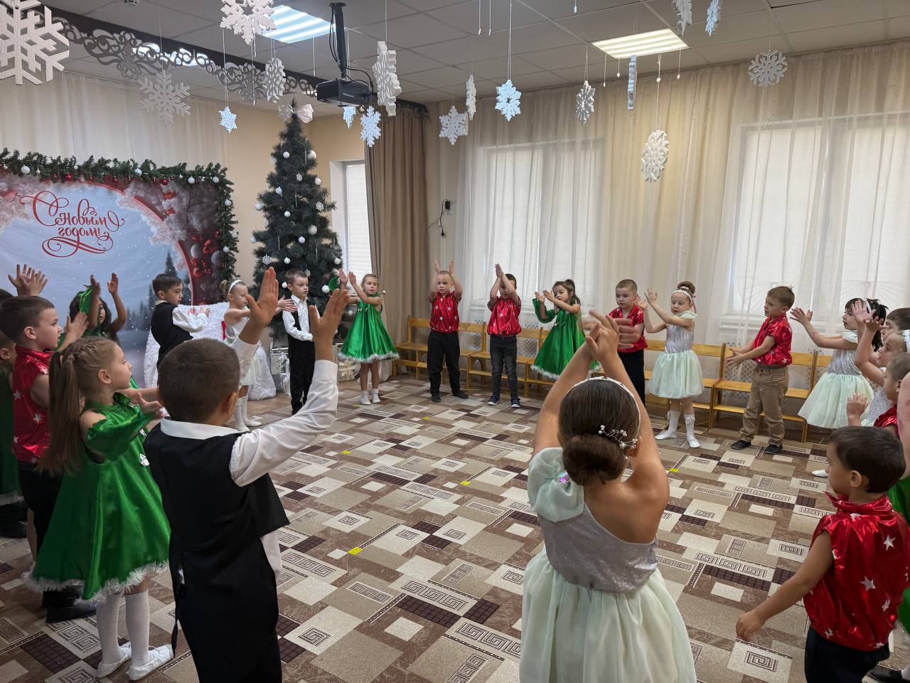 Новый Год - это самый волшебный, веселый праздник, которого дети ждут, веря в сказку и чудо… С 23 по 25 декабря в нашем детском саду прошли новогодние утренники. Красиво украшенный зал, нарядная елка, подарки, Дед Мороз и Снегурочка и множество других сказочных персонажей ожидали детей дошкольного учреждения. Ребята погрузились в мир чудес, приключений, невероятных превращений и сюрпризов. Все дошколята с удовольствием проявляли свои таланты: танцевали, водили хороводы, рассказывали стихи, пели песни, играли. Никто не остался равнодушен. Море радости и эмоций вызвали подарки, врученные детям из рук самого Дедушки Мороза! Праздник получился очень весёлый и радостный и оставил много приятных впечатлений и эмоций.