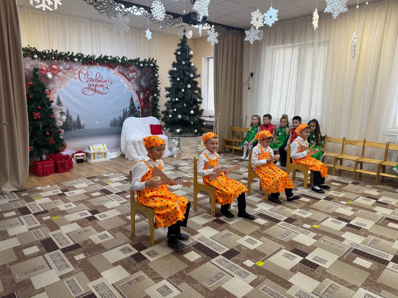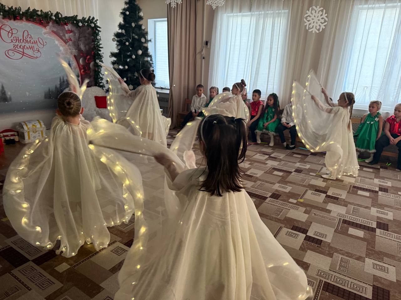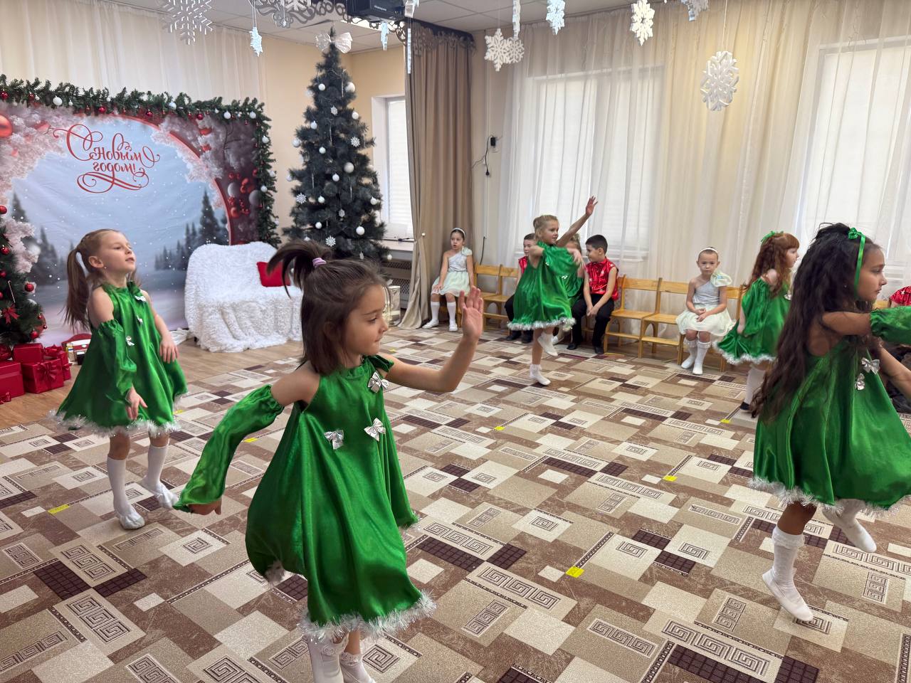 Новый Год - это самый волшебный, веселый праздник, которого дети ждут, веря в сказку и чудо… С 23 по 25 декабря в нашем детском саду прошли новогодние утренники. Красиво украшенный зал, нарядная елка, подарки, Дед Мороз и Снегурочка и множество других сказочных персонажей ожидали детей дошкольного учреждения. Ребята погрузились в мир чудес, приключений, невероятных превращений и сюрпризов. Все дошколята с удовольствием проявляли свои таланты: танцевали, водили хороводы, рассказывали стихи, пели песни, играли. Никто не остался равнодушен. Море радости и эмоций вызвали подарки, врученные детям из рук самого Дедушки Мороза! Праздник получился очень весёлый и радостный и оставил много приятных впечатлений и эмоций.