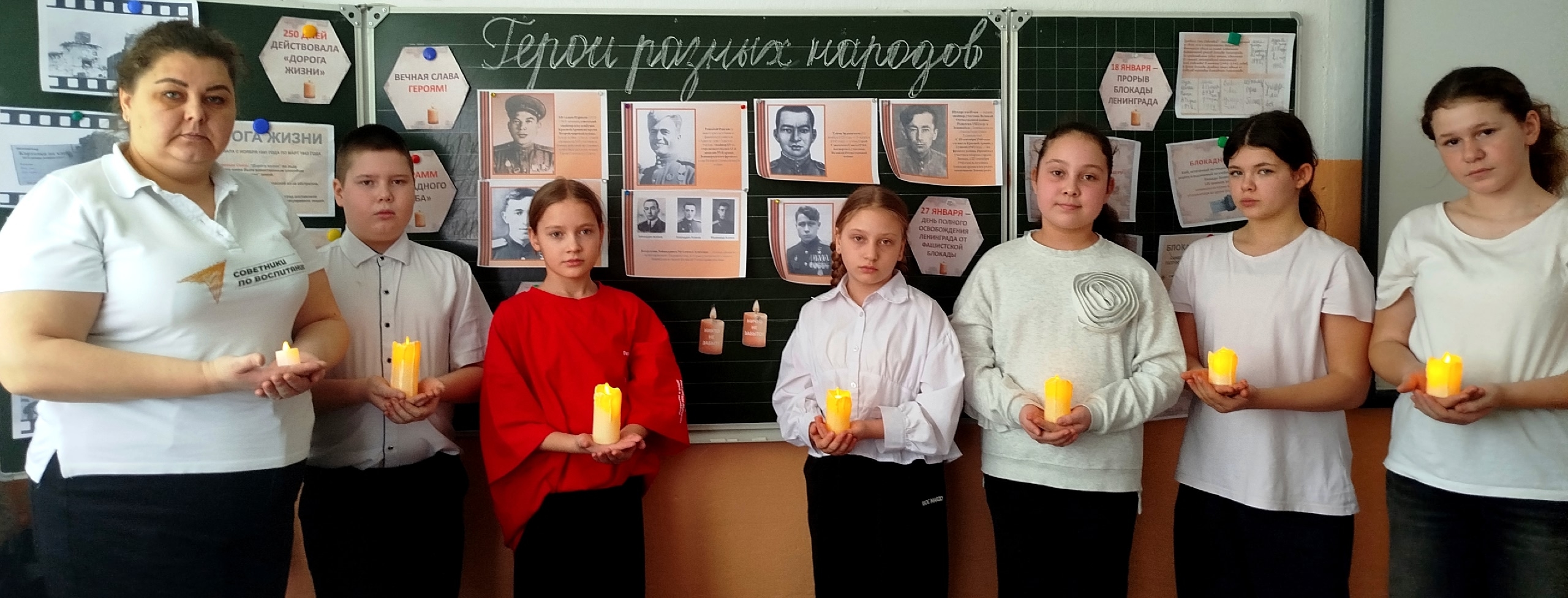 В рамках Всероссийской акции "Свеча памяти у Невы» активисты первичного отделения Движения Первых школы по инициативе советника по воспитанию подготовили материал и оформили галерею портретов «Герои разных народов: защитники Ленинграда».